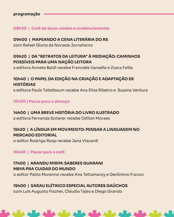 Neste 2025, finalmente, darei uma passada rápida pelo evento “O negócio do livro” e participarei de uma mesa-redonda. Claro que vou tentar assistir a outras que me interessam demais e nas quais vão falar editores e escritores gaúchos.
